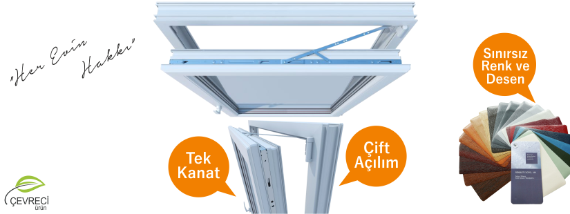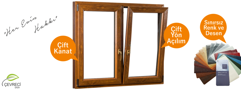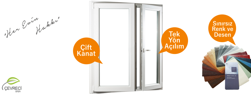 Çift açılım pencereler Avrupa stilinde ve iki farklı açılım fonksiyonuna sahiplerdir. Tıpkı kapılar gibi açılabilirler ve ayrıca çift yöne açılım aksesuar seçeneği ile kanadın üst kısmının içeriye doğru eğilerek aralanması ile mekanlarınızın kolayca havalandırılması maksatlı bir fonksiyona sahiptirler. Bir kol ile iki fonksiyon da kontrol edilebilir.